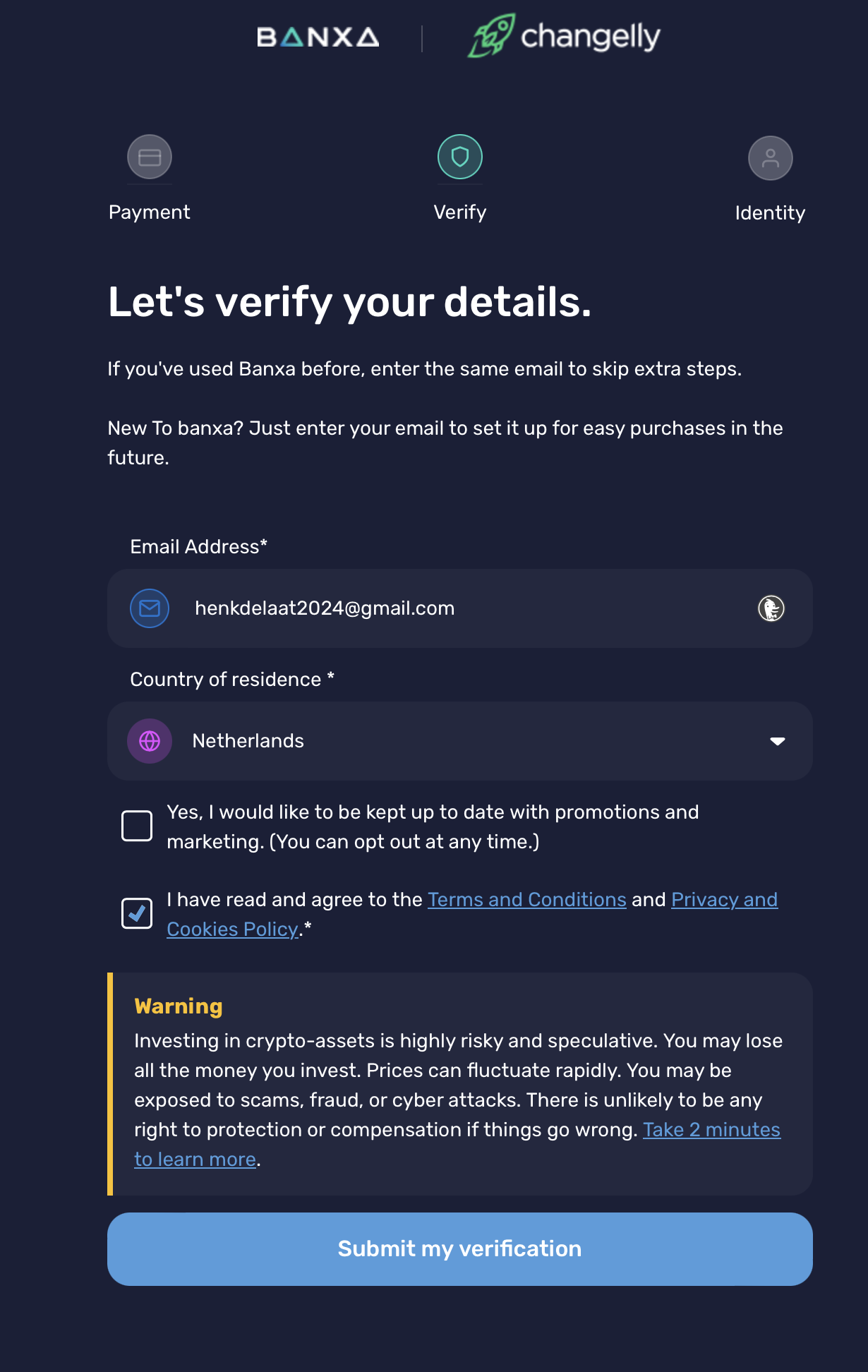 Voer jouw ‘e-mail adres’ in, kies ‘netherlands’ bij country of residene en accepteer de algemene voorwaarden en klik op ‘submit my verification’ (Zie voorbeeld hieronder).