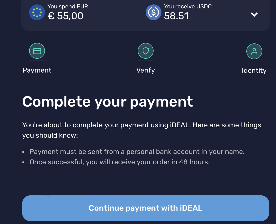 Met onze betaaloptie kun je eenvoudig en veilig betalen via bovenstaande geintegreerde widget. Je hebt geen technische kennis nodig, want het USDC ontvangstadres staat al ingevuld. Het enige wat je doet is een banktransactie en wij ontvangen USDC en jij krijgt 13.5% minder kosten. Hieronder een uitleg die je stap voor stap meeneemt.