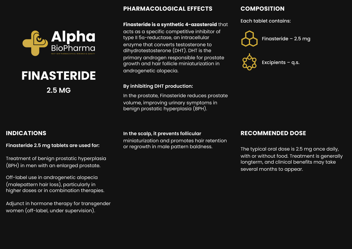 Finasteride is een zogenaamde 5-alfa-reductaseremmer. Het werd oorspronkelijk ontwikkeld voor de behandeling van benigne prostaathyperplasie (BPH), oftewel een goedaardige prostaatvergroting. Later werd ontdekt dat het ook effectief is bij het tegengaan van erfelijke haaruitval (androgenetische alopecia).