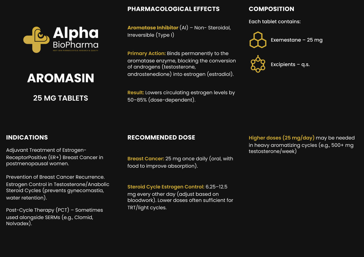 Aromasin, met de werkzame stof exemestaan, behoort tot de derde generatie aromataseremmers. Het middel blokkeert het enzym aromatase, dat verantwoordelijk is voor de omzetting van androgenen naar oestrogeen. Hierdoor daalt het oestrogeenniveau in het lichaam, wat ideaal is voor sporters die oestrogeen-gerelateerde bijwerkingen zoals gynaecomastie of vochtretentie willen voorkomen.