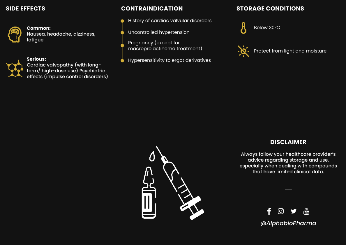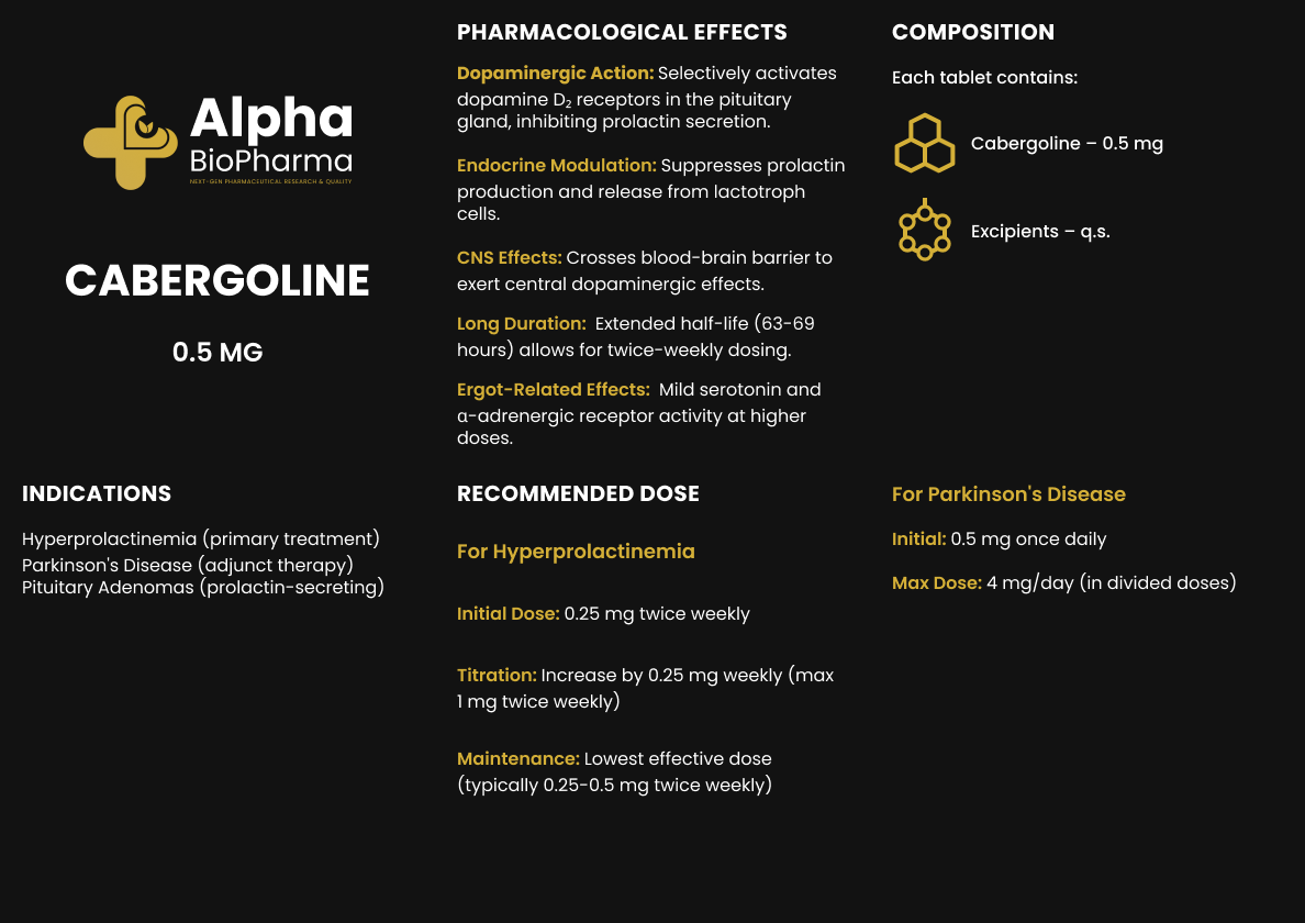 Cabergoline is een krachtig dopamine-agonist die de aanmaak van het hormoon prolactine onderdrukt. Het wordt medisch gebruikt voor de behandeling van aandoeningen veroorzaakt door een verhoogd prolactineniveau, zoals prolactinomen en hormonale disbalans.