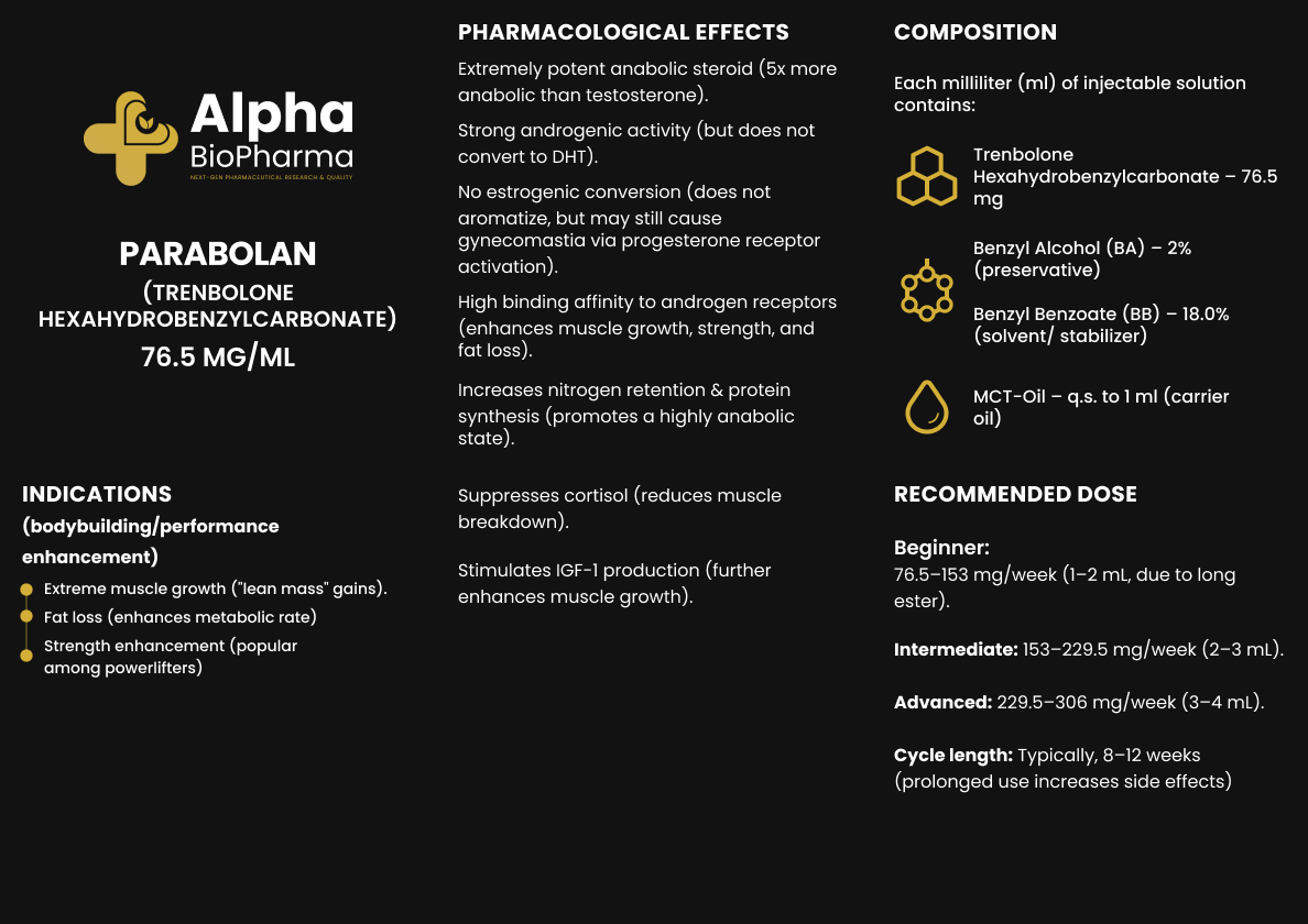 Parabolan, geproduceerd door Alpha BioPharma, is geïnspireerd op de originele Trenbolone-formule. Deze is oorspronkelijk ontwikkeld voor veterinair gebruik. Trenbolone werd al snel erkend als een van de krachtigste anabole steroïden op de markt, en Parabolan brengt deze kracht naar een hoger niveau door een geconcentreerde dosis van per milliliter aan te bieden.