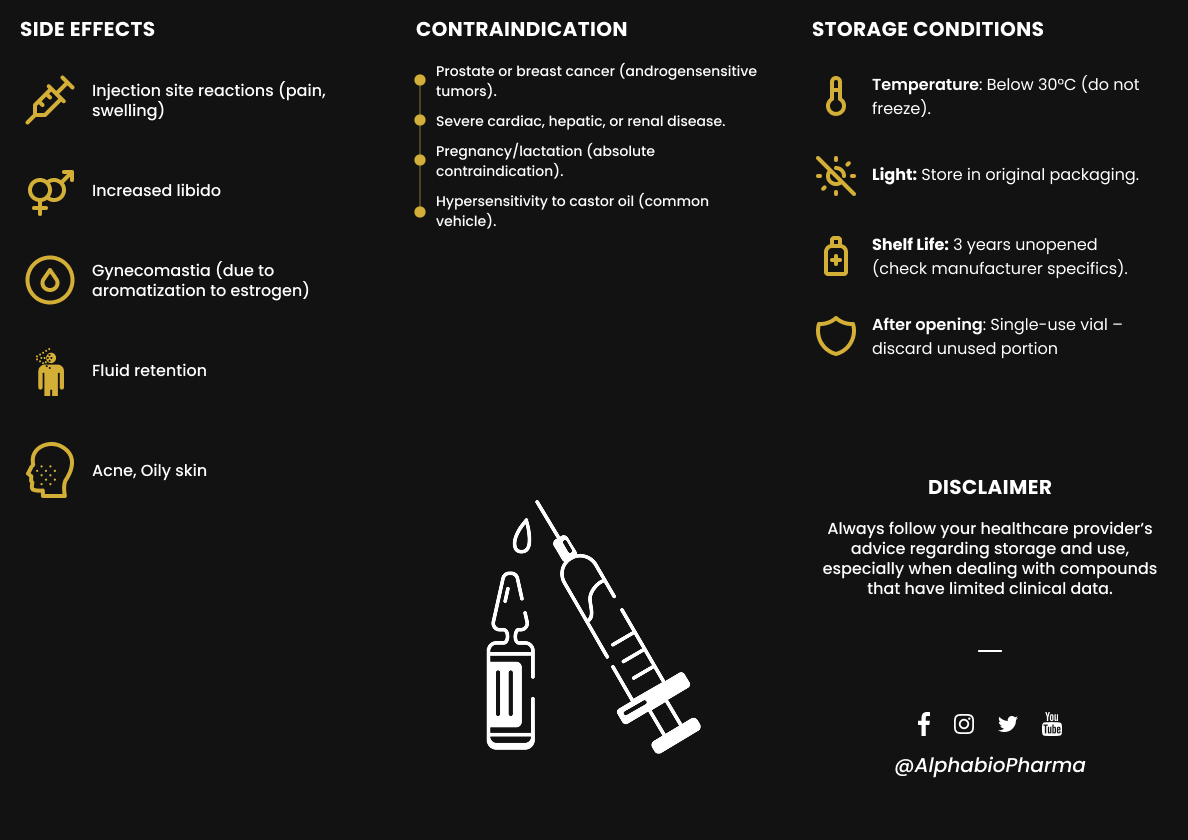 Deze steroïde wordt langzaam en gelijkmatig in het lichaam afgegeven, wat leidt tot stabiele bloedspiegels van testosteron. Daardoor ervaar je minder pieken en dalen vergeleken met kortwerkende esters zoals propionaat of enanthaat. Bij injectie blijft het effect vaak tot 10–14 weken merkbaar, wat het een ideale keuze maakt voor wie niet frequent wil injecteren.