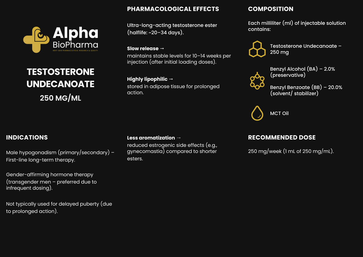 Vergeleken met andere vormen van testosteron heeft Testosterone Undecanoate een unieke combinatie van gemak en stabiliteit. De injecties zijn minder frequent nodig, wat het comfort verhoogt. En de orale vorm (als undecanoaat in vetoplosbare capsules) is effectiever dan veel andere orale testosteronopties, dankzij opname via het lymfestelsel.