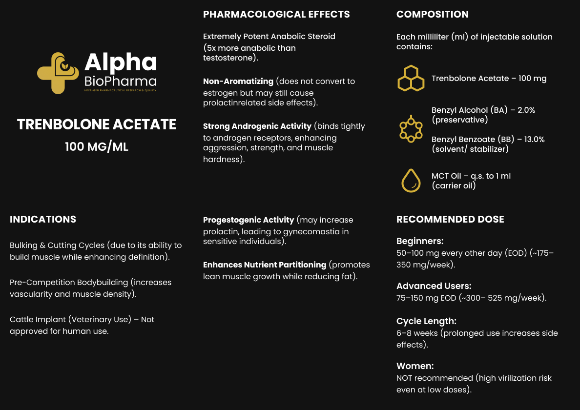 Welkom bij onze uitgebreide productomschrijving van Trenbolone Acetate 80 mg van Alpha BioPharma. Dit is een krachtige anabole steroïde die geliefd is bij bodybuilders en atleten vanwege zijn vermogen om indrukwekkende spiermassa en krachttoenames te leveren. In deze gedetailleerde beschrijving zullen we de historie van het product, de juiste gebruiksrichtlijnen, de voordelen, combinatiemogelijkheden met andere steroïden, kuurschema’s, Trenbolone Acetate kopen, mogelijke bijwerkingen, fictieve klantervaringen en een conclusie behandelen.